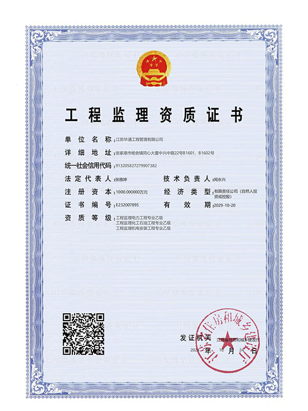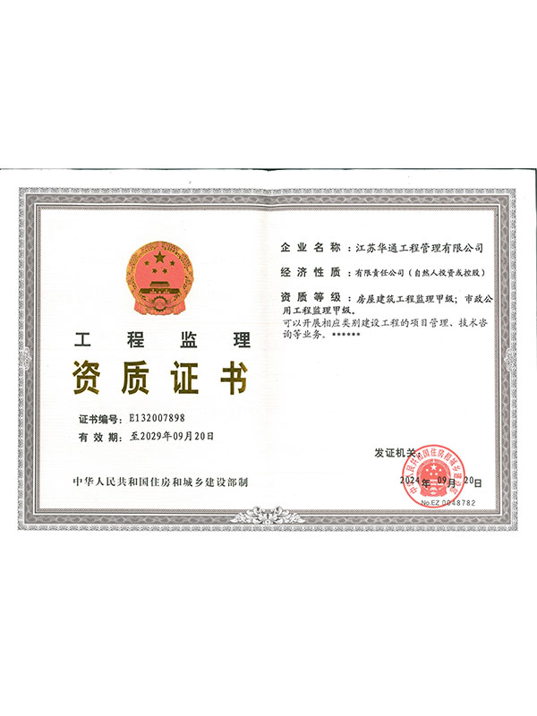 目前具有房屋建筑工程监理、市政公用工程监理、人防工程监理、造价咨询四个甲级资质;机电安装工程监理、电力工程监理、化工石油监理、工程招标代理、政府采购(货物)招标代理、水利工程施工监理(水利部)六个乙级资质以及建筑装饰装修工程专业承包二级资质、建筑装饰工程设计专项丙级资质。
